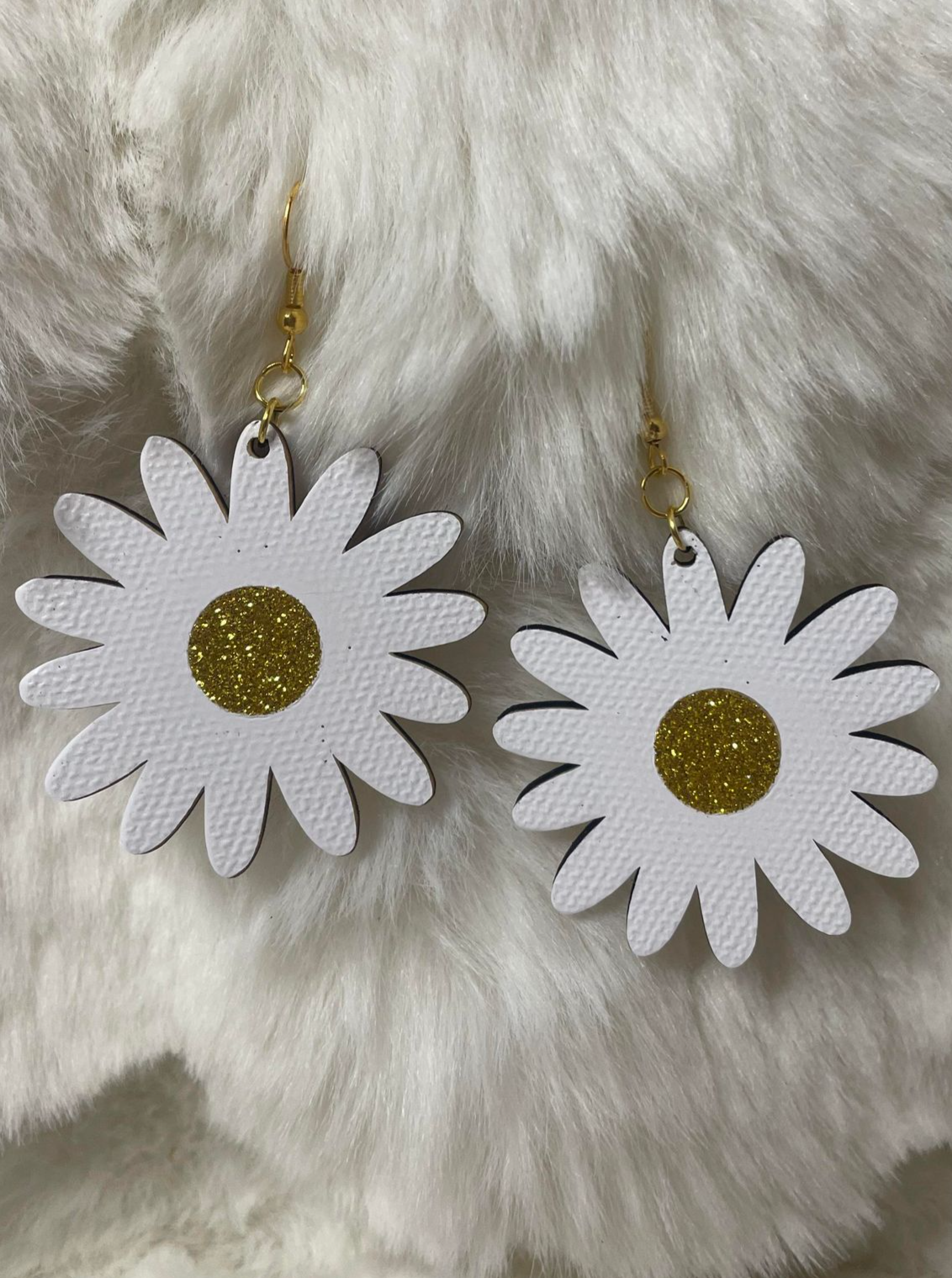 Be the best in bloom with our Crazy Daisy Earrings! Featuring a white daisy floral shape, glitter gold accents on white vinyl, and gold hardware with fish hook back. Made with a bass wood base for a lightweight and comfortable wear. Perfect for adding a touch of playfulness and quirkiness to any outfit.